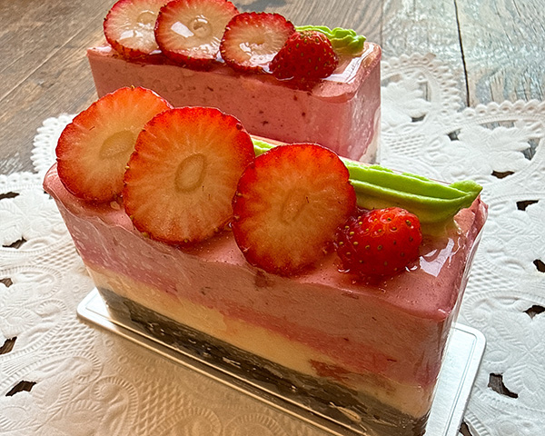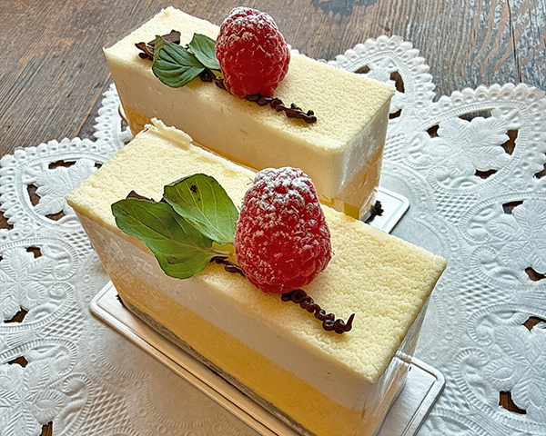 コクのあるクリームチーズをなめらかに仕上げ、中にキルシュの効いたスポンジとフランボワーズのジャムを忍ばせました。
