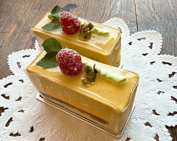 濃厚なピスタチオと爽やかなアプリコットのムース。ほろ苦いココアが全体を引き締めます。